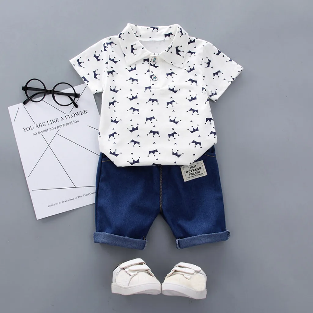 ORIGINAL Summer Fashion Toddler Baby Clothing Toddler Baby Outfits Short Sleeve Crown Pattern Shirt Tops+Den